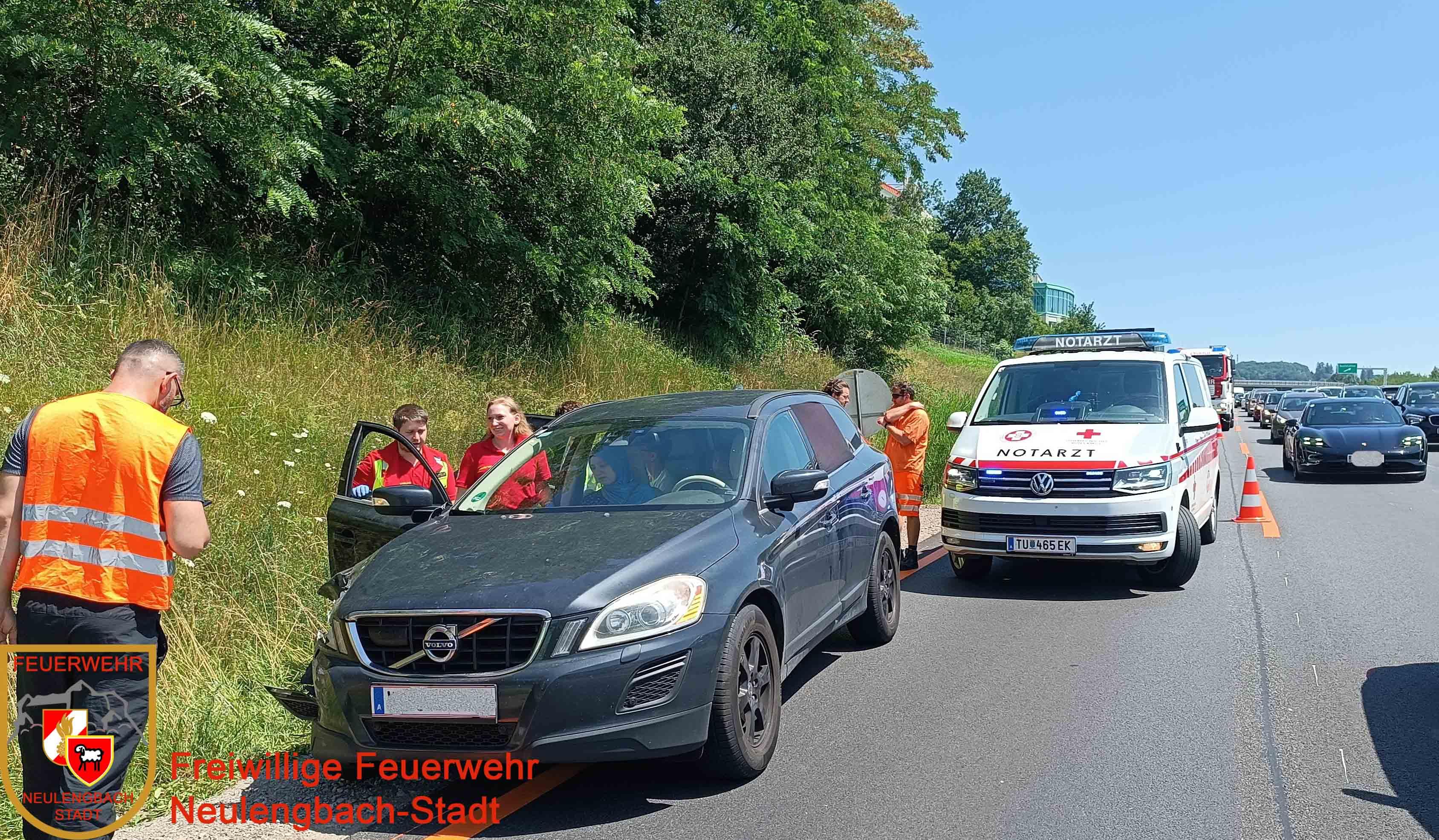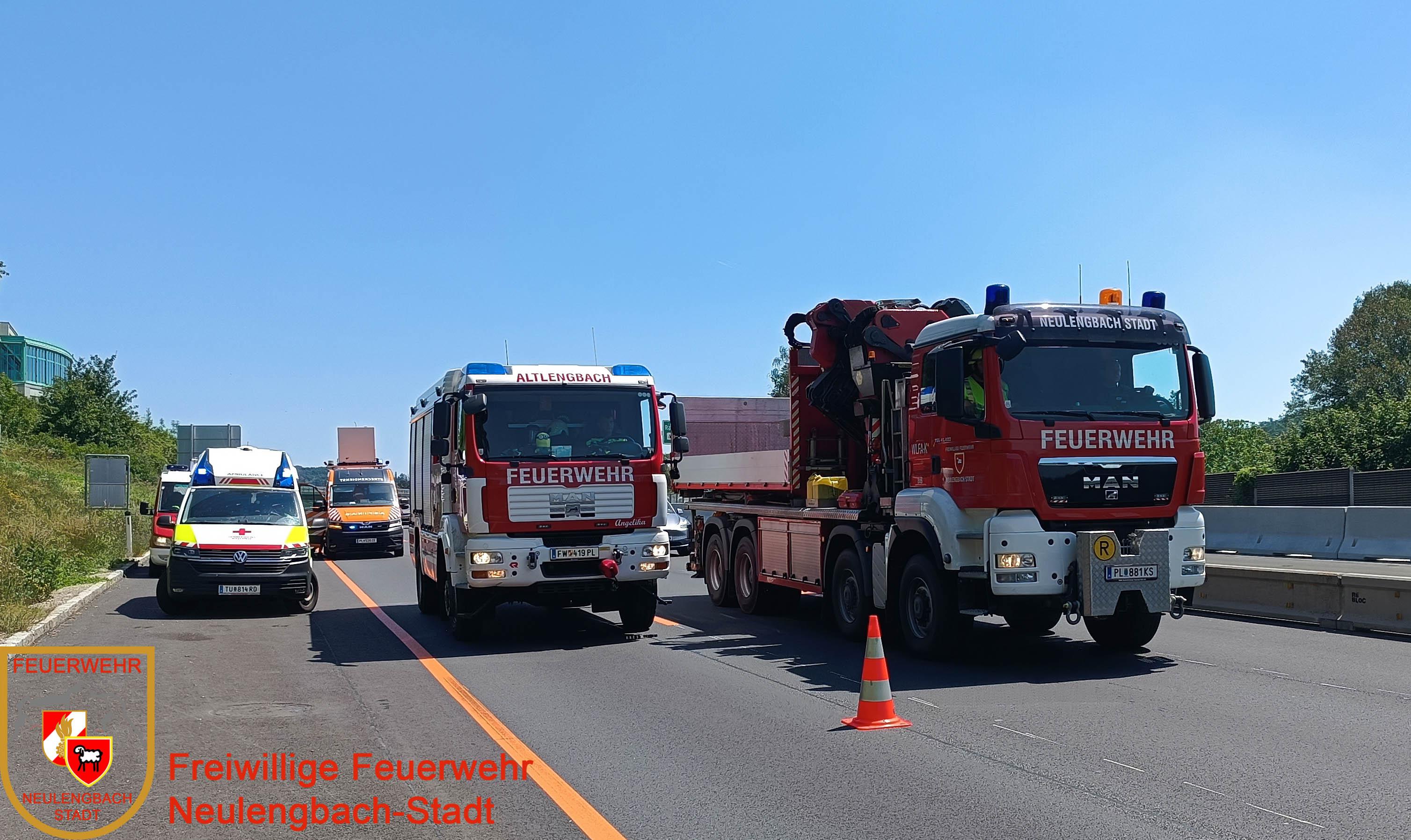 Um 11:58 Uhr erreichte uns die zweite Alarmierung zu einer Menschenrettung ebenfalls auf die A1, diesmal in Fahrtrichtung Salzburg. Gerade als das Vorausrüstfahrzeug ausrücken wollte, informierte uns die Bereichsalarmzentrale St. Pölten, dass die Kilometer Angabe nicht stimmt, aus diesem Grund wurde zusätzlich die Freiwillige Feuerwehr Altlengbach alarmiert, die Freiwillige Feuerwehr Kirchstetten war ebenfalls schon auf der Autobahn auf Anfahrt, wodurch wir nur das Wechselladefahrzeug in Gang setzten. Die verletzte Person war zum Glück nicht eingeklemmt und wurde mit Verletzungen unbestimmten Grades in ein umliegendes Krankenhaus verbracht. Der verunfallte PKW wurde mit dem Bergeplateau auf einem Parkplatz gesichert abgestellt. Der zweite PKW konnte unter polizeilicher Begleitung die Autobahn selbstständig verlassen.