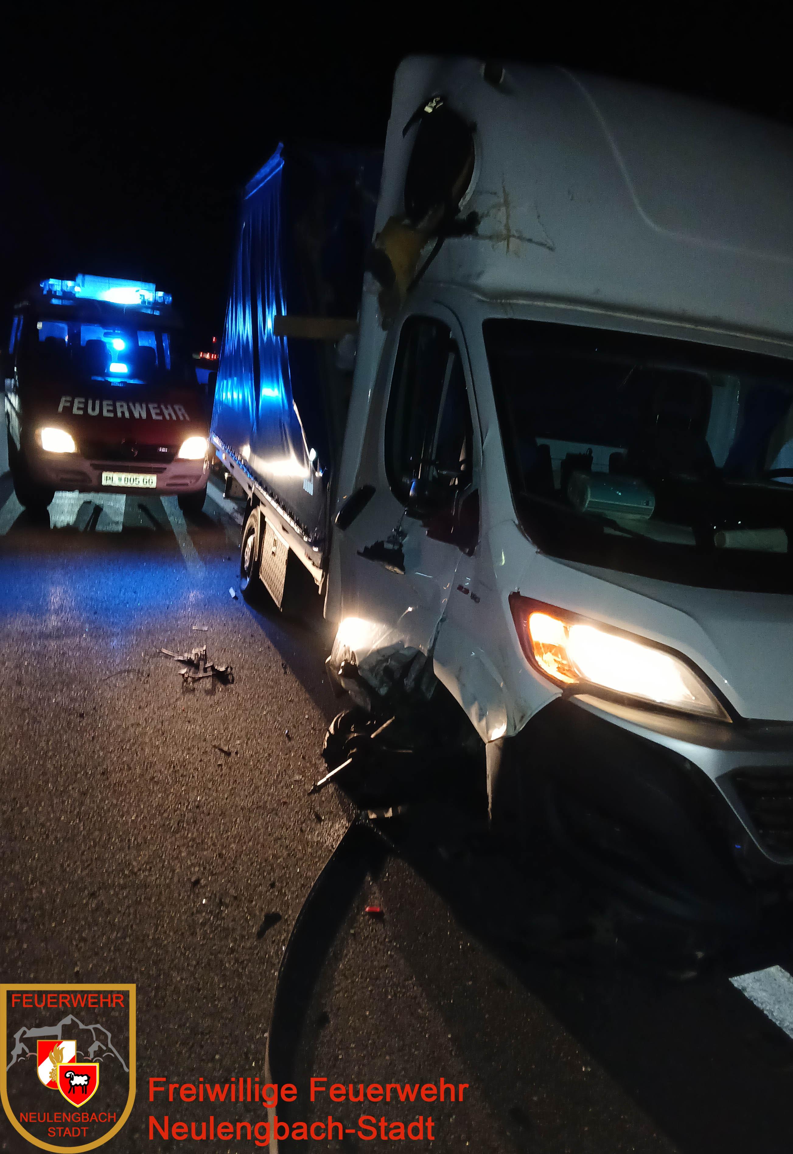Der erste Einsatz des Tages führte die Feuerwehrkräfte in den frühen Morgenstunden auf die A21, Richtungsfahrbahn A2. Laut Alarmierung handelte es sich um eine Fahrzeugbergung, um rasch eine Lageerkundung durchführen zu können, rückte der Einsatzleiter zunächst mit dem Versorgungsfahrzeug aus. Bei Eintreffen stellte sich heraus, dass ein Kleintransporter auf dem dritten Fahrstreifen durch einen Auffahrunfall schwer beschädigt war.