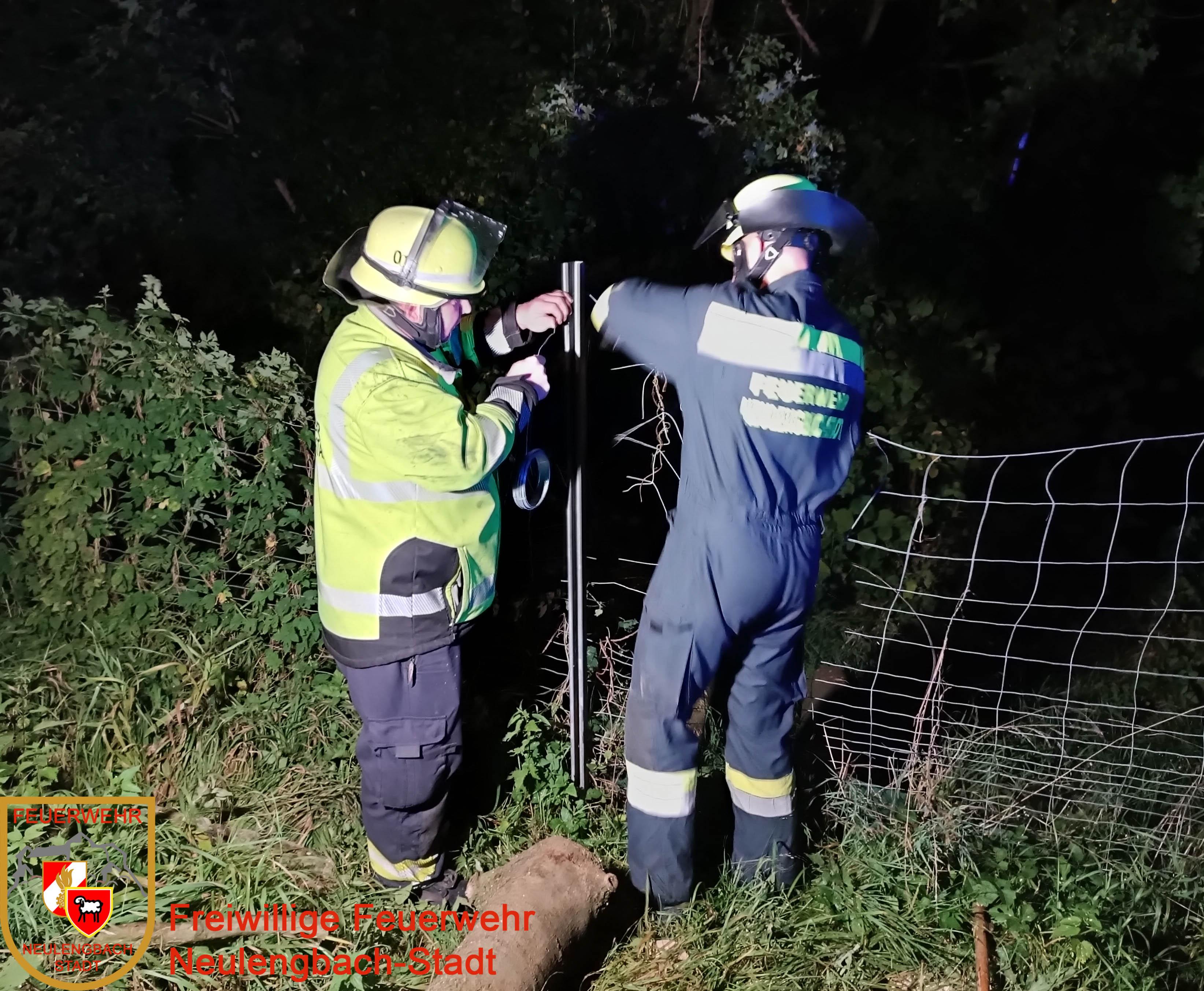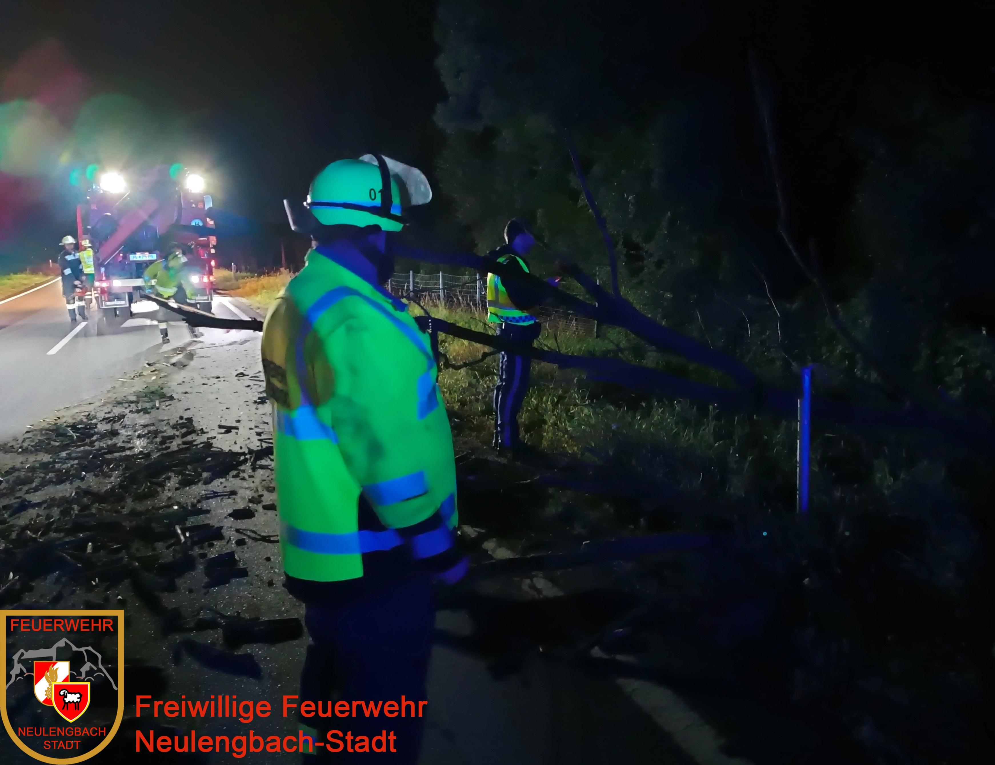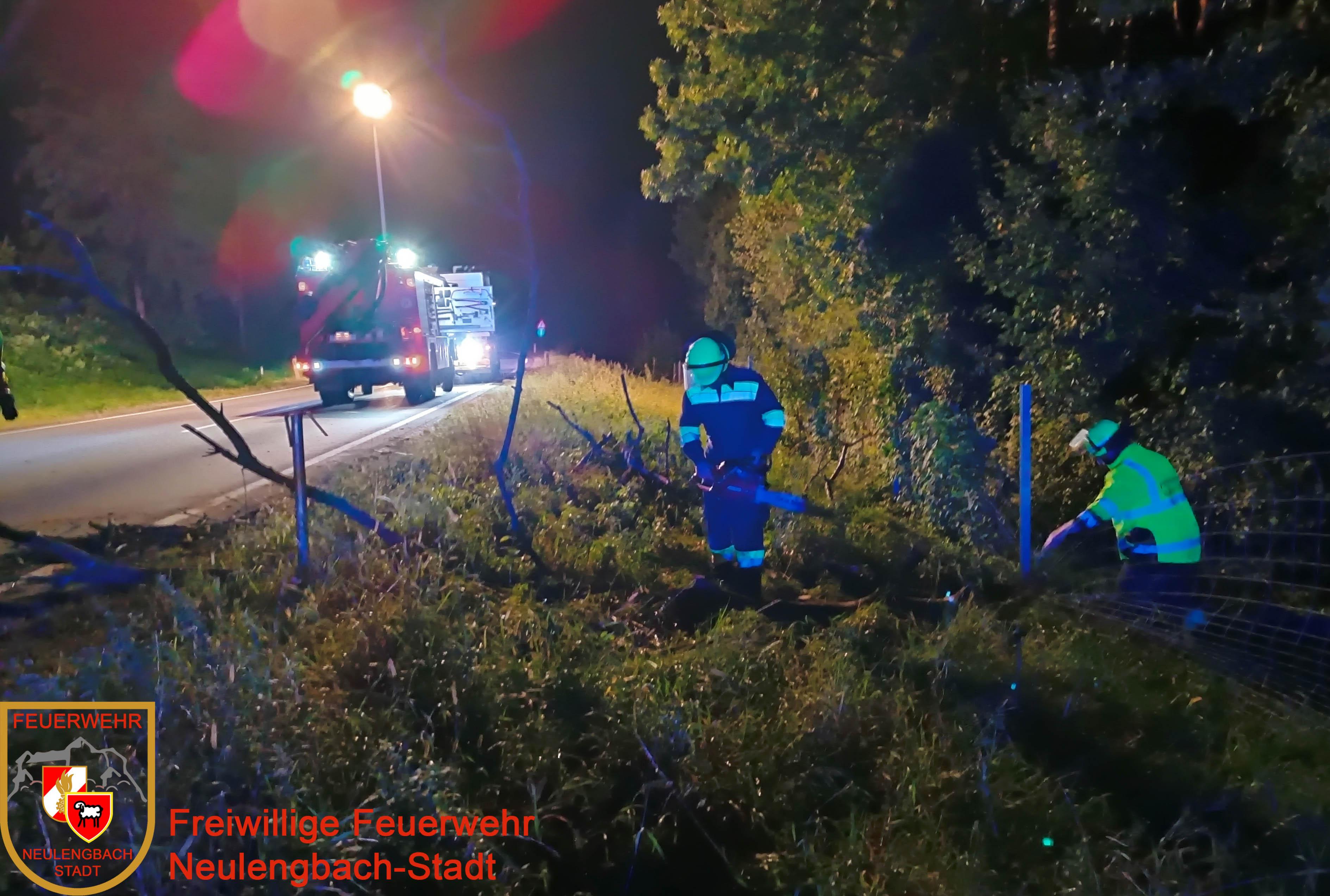 Ein Baum war auf die Fahrbahn gestürzt und hatte zwei PKW beschädigt. Die Polizei war bereits vor Ort, beide Fahrzeuge konnten die Unfallstelle selbstständig verlassen. Der Baum wurde mittels Motorkettensäge zerkleinert, am Fahrbahnrand abgelegt und die Straße anschließend gereinigt. Der beschädigte Wildschutzzaun wurde provisorisch mit Draht gesichert.