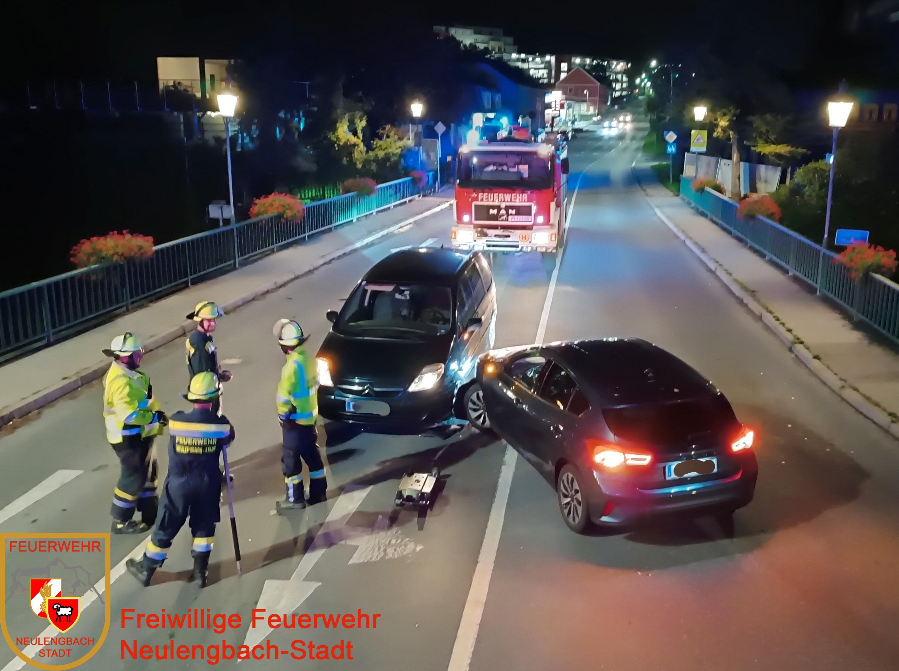 Kaum zurück im Feuerwehrhaus, wurden die Kameraden über Telefon und Funk zu einem Verkehrsunfall alarmiert: Zwei PKW waren an der Scharfkreuzung B44/B19 kollidiert. Aufgrund der unklaren Lage wurde sofort das Voraus-Rüstfahrzeug (VRF) zur Erkundung entsandt.