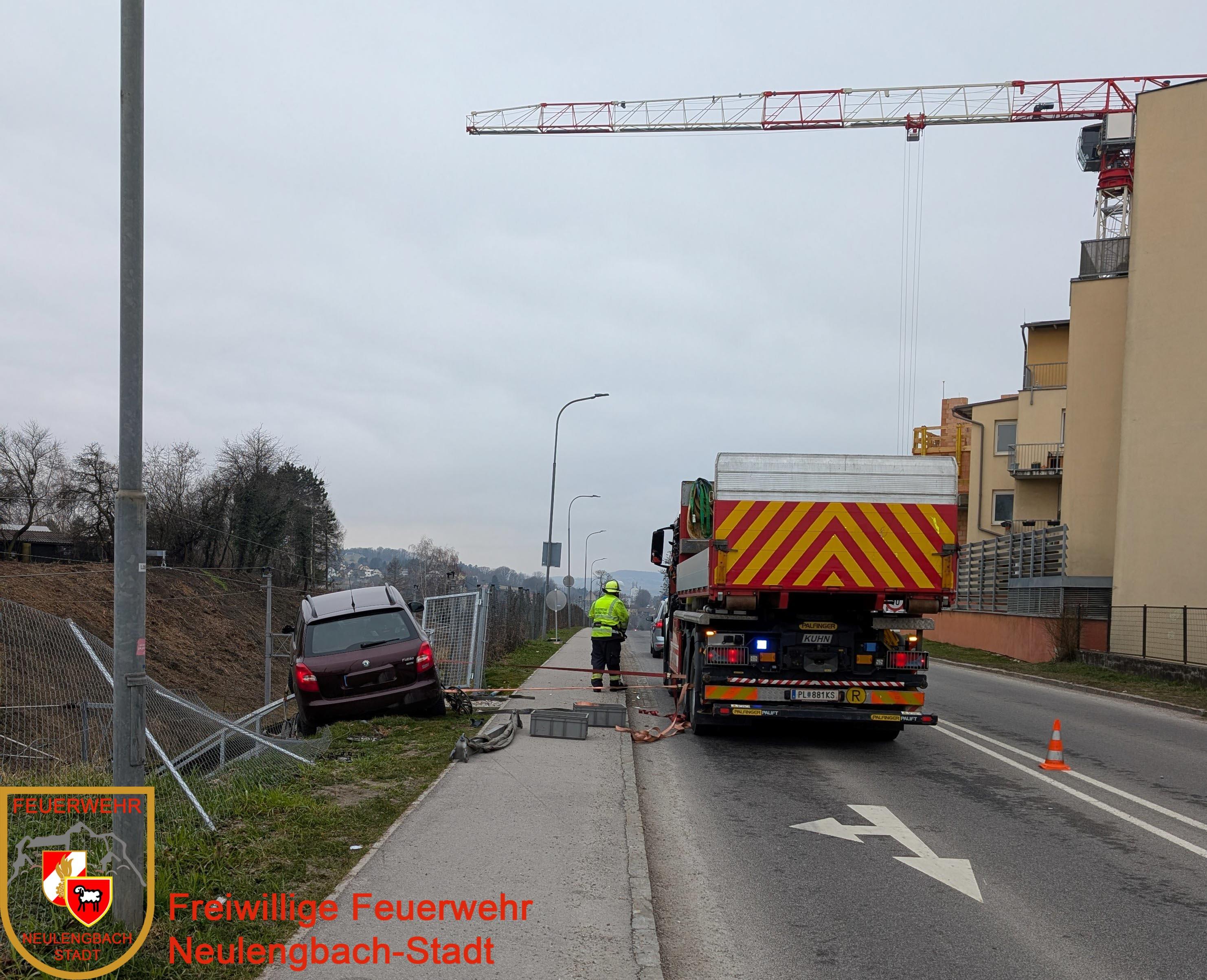 Ein PKW war aus bislang unbekannter Ursache von der Fahrbahn abgekommen, über den Gehsteig gefahren und hatte dabei einen Zaun sowie das Geländer einer Wartungsstiege zum Gleiskörper niedergerissen. Das Fahrzeug kam unmittelbar vor der steilen Böschung zum Stillstand und drohte bei jeder weiteren Bewegung auf den darunterliegenden Gleisbereich abzustürzen.