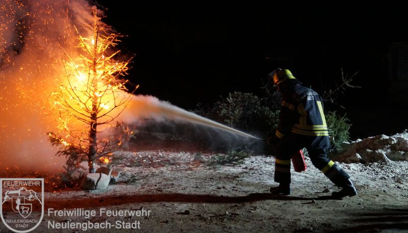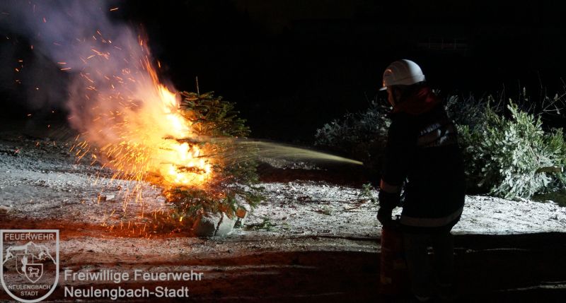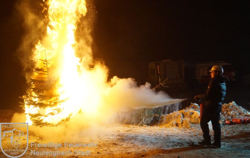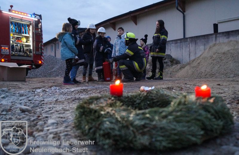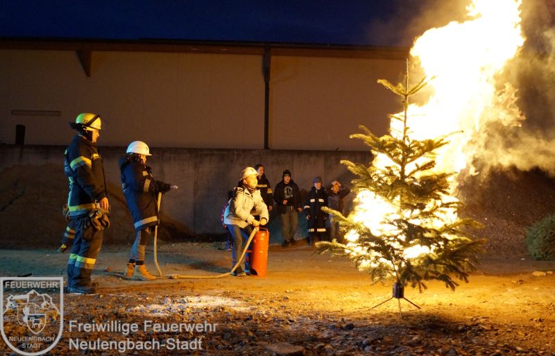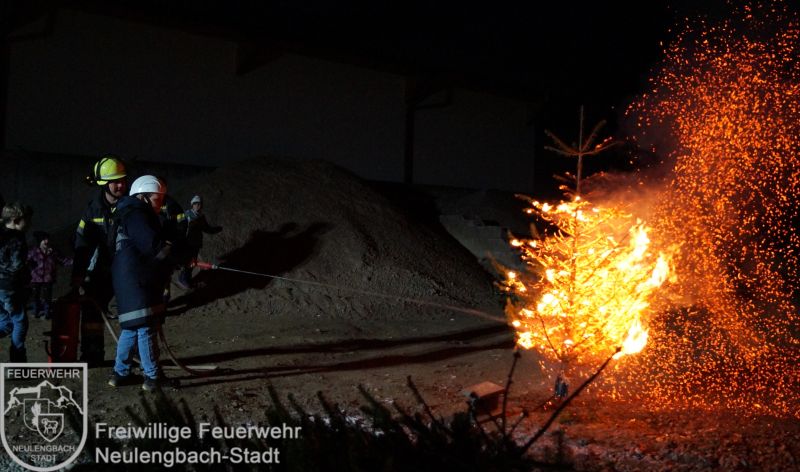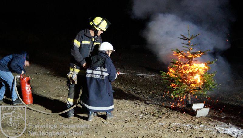 Mit dem Versorgungs- und Vorausrüstfahrzeug fuhren alle gemeinsam auf ein Übungsgelände, hier warteten schon Christbäume, Adventkränze, Feuerlöscher und eine Kübelspritze. Zu Beginn gab es eine kurze Einführung über die verschiedenen Feuerlöscharten, danach ging es auch schon daran, das Erlente in die Praxis umzusetzen. Obwohl die Begeisterung der Kinder über diese Übung riesig war, so wuchs auch der Respekt mit der Erkenntnis, wie schnell Christbäume Feuer fangen können.