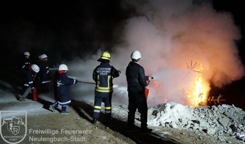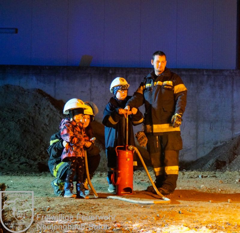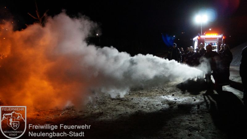 Um 17:00 Uhr traf die Feuerwehrjugend im Feuerwehrhaus ein, welche ebenfalls von ihren Betreuern in der Einsatzadjustierung empfangen und mit dem Tanklöschfahrzeug zum Übungsplatz gefahren wurde. Natürlich bekam auch unsere Jugendgruppe eine Einschulung und schon konnte auch für sie das Löschen losgehen. Nachdem jeder einen Brand alleine mit Unterstützung der Betreuer erfolgreich löschen konnte, wurde abschließend ein großer Brand entzündet, dem ein frontaler Löschangriff mit sieben Feuerlöschern gleichzeitig erfolgte.