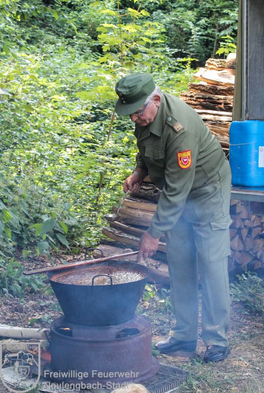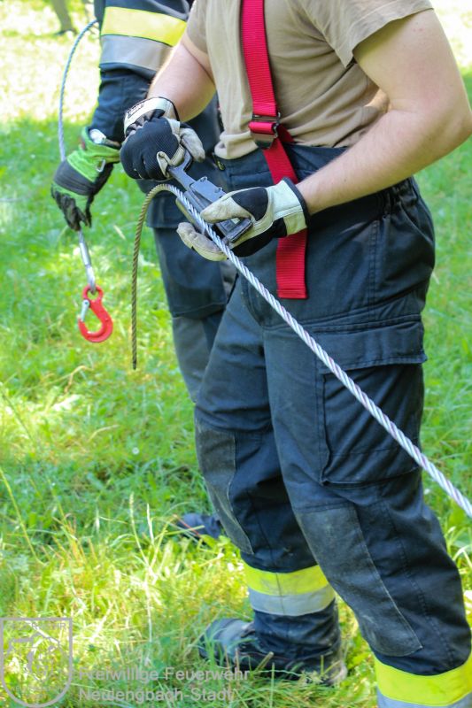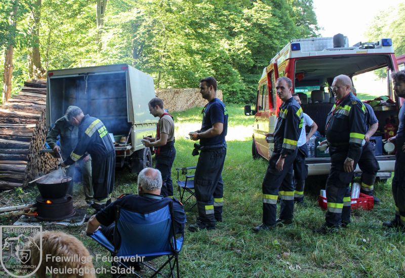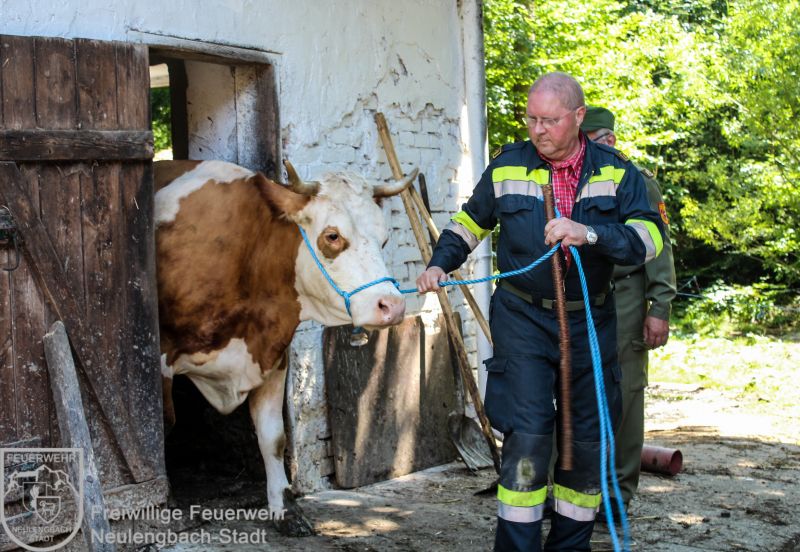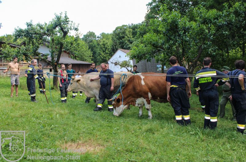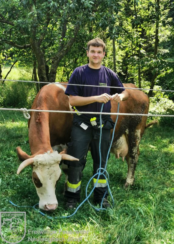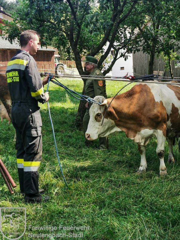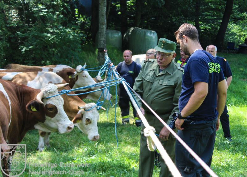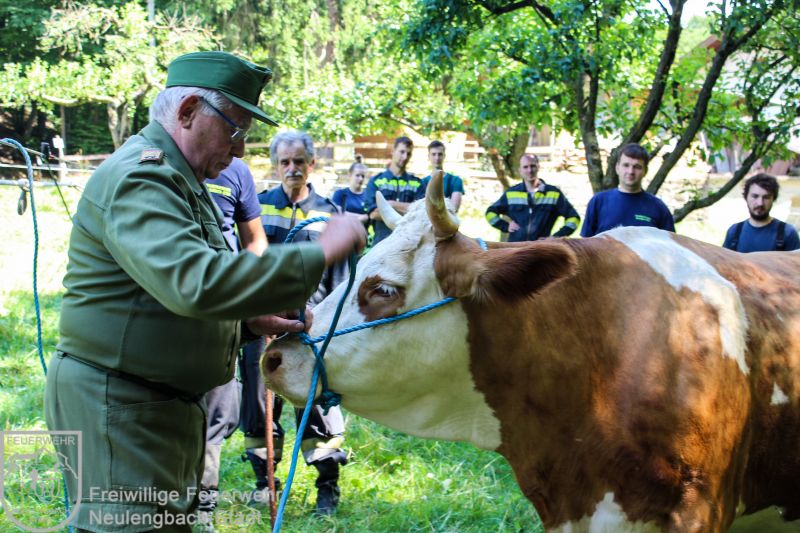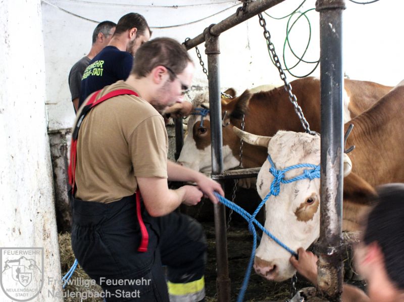 Das in den beiden ersten Übungseinheiten Erlernte sollte nun am lebenden Objekt angewendet werden. Zu diesem Zweck fanden sich die übenden Mitglieder der Freiwilligen Feuerwehr Neulengbach-Stadt am Hof der Familie Gfatter ein. Nach einer kurzen Wiederholung der wichtigsten Verhaltensregeln, Handgriffe und Knoten wurde es auch schon ernst: Zuerst wurden zwischen zwei Bäumen ein Draht- und ein Kunststoffseil gespannt. Dann wurden sechs Kühe mithilfe von aus Stricken zurechtgemachten Behelfshalftern von Feuerwehrmitgliedern aus dem Stall zu den Seilen zwischen den Bäumen geführt, wo die Tiere festgemacht wurden. Begleitet wurden sie dabei von Mitgliedern der Familien Gfatter und Köcher, die laufend Tipps gaben bzw. unterstützend eingriffen, wenn eines der Tiere dann doch einmal versuchte, seinen eigenen Willen durchzusetzen. Da sich die Rinderdamen im Großen und Ganzen aber als recht folgsam erwiesen, konnten sie nach getaner Mitarbeit bald auf ihre abendliche Weide entlassen werden. Doch auch die übenden Feuerwehrmitglieder mussten nicht Hunger leiden, denn zur abschließenden Übungsnachbesprechung gab es eine von der Fa. Köcher bereitgestellte Gulaschsuppe und Getränke.