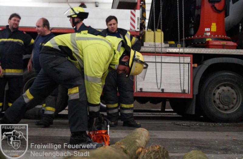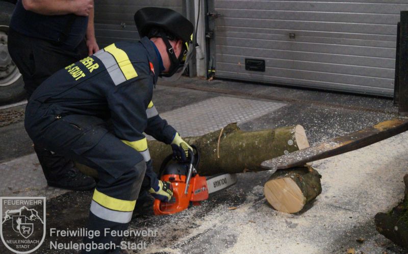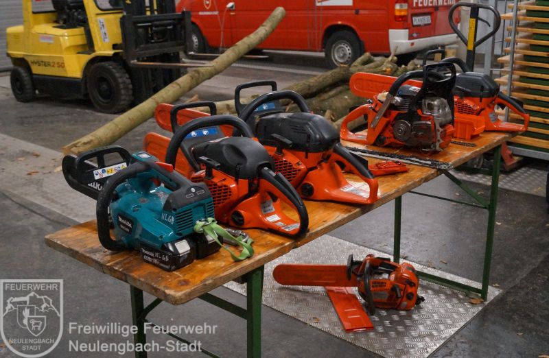 An einer Reihe von Stämmen konnten die Mitübenden das theoretisch besprochene dann in der Praxis anwenden. Anschließend ging es an das gemeinschaftliche Reinigen der Sägen.