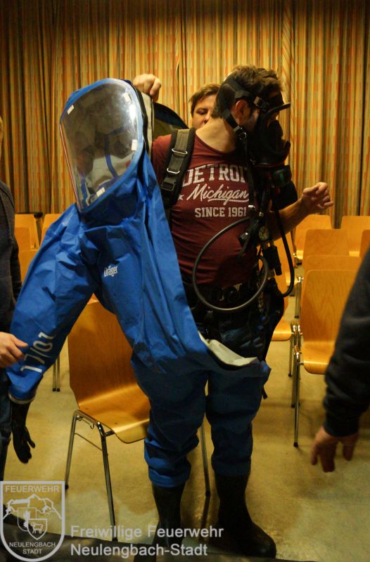 Am 9.2.2022 gab es dann eine Einheit zum Thema Schadstoff. Geübt wurde das Arbeiten mit Schadstoffanzügen der Schutzstufe 3 und ihre Versorgung mit einer externen Frischluftversorgung. Ebenfalls Teil der Übung war das Arbeiten mit einer Handmembranpumpe, mit der auch leicht entzündliche Schadstoffe sicher umgepumpt werden können.