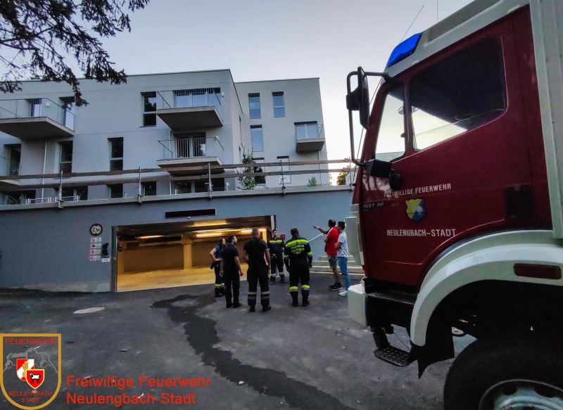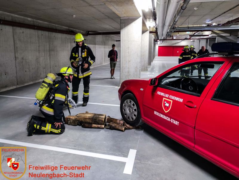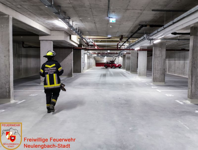 Übungsannahme war ein ausgelöster Druckknopfmelder in der Tiefgarage. Nachdem über die Brandmeldezentrale und dem dort befindlichen Lageplan bestimmt war, in welchem Bereich der Garage der betroffene Melder ausgelöst hat, wurde bei der Erkundung festgestellt, dass es sich nicht um einen Brand handelt.