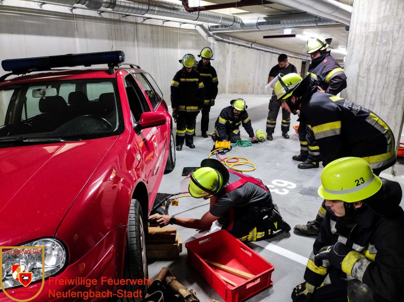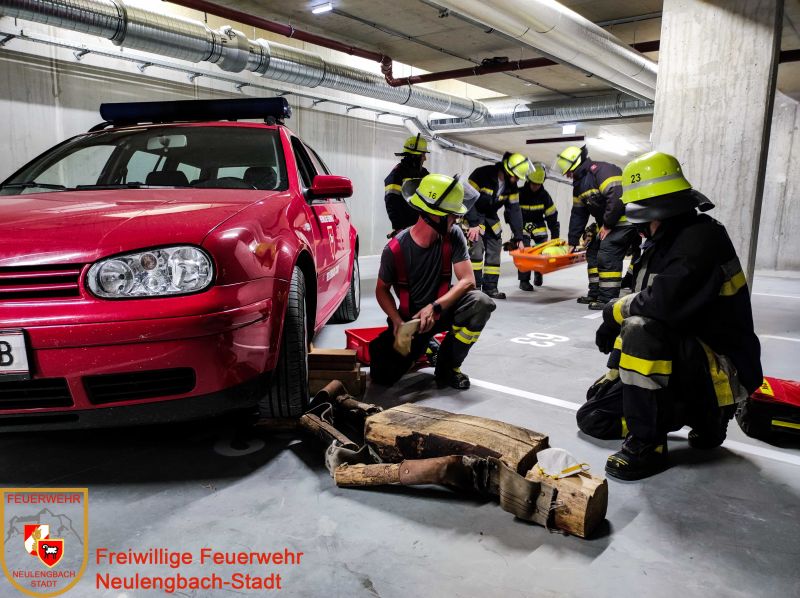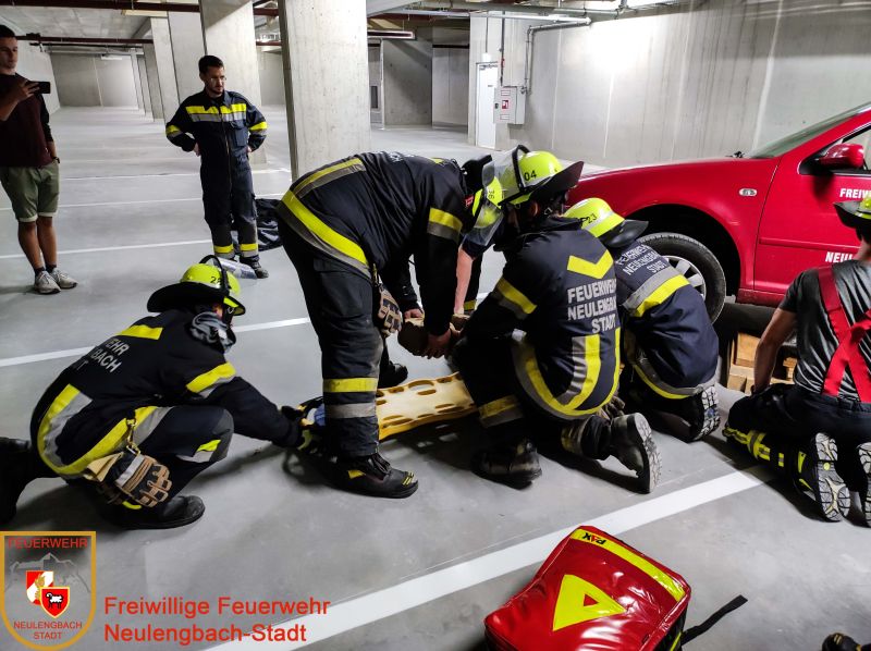Der Pkw wurde von der Mannschaft mithilfe von Radkeilen gesichert und mit Hebekissen angehoben, der Dummy behutsam mit dem Spineboard ins Freie getragen und dem Rettungsdienst übergeben.