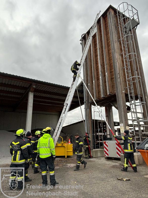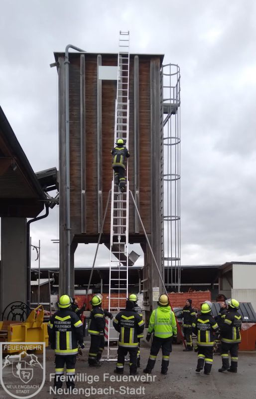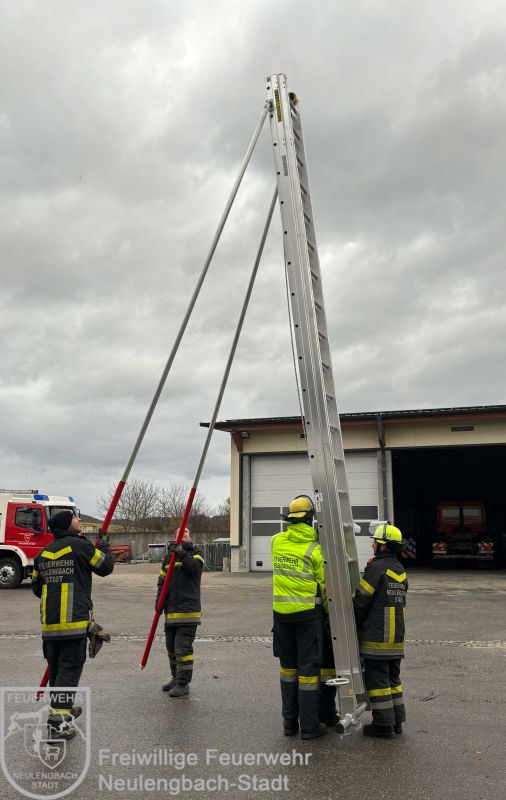 Kurz darauf am 25. November 2023 fand die erste Ausbildungseinheit für die Mitglieder statt, beübt wurde dabei die neue 3-teilige Schiebeleiter, welche am HLF aufgepackt ist. Da die Leiter etwa 63 kg schwer ist, eine Gesamtlänge von 14m misst und eine Arbeitshöhe von bis zu 12m erreicht, ist die Bedienung nicht mehr so einfach und die Kameraden sollten diese zumindest einmal gesehen haben. In mehreren Durchgängen wurden alle Positionen und Befehle besprochen und durchgegangen sowie die Leiter mehrmals aufgestellt und abschließend von einem Kameraden bestiegen.