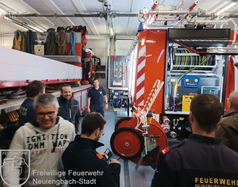 in Empfang zu nehmen. Vor Ort wurde zuerst die Beladung auf Vollständigkeit überprüft und anschließend die Einschulung vom Rosenbauer Team für unsere sechs Kameraden vollzogen. Am Abend ging es für die Mannschaft samt neuen Lkw wieder nach Neulengbach, wo schon einige Kameraden warteten, um das neue Fahrzeug zu besichtigen und sich mit der Beladung vertraut zu machen.