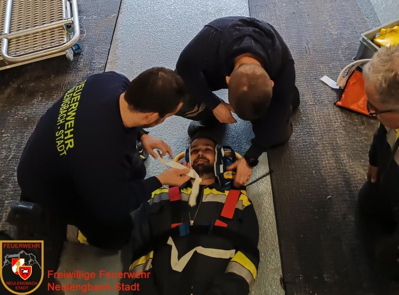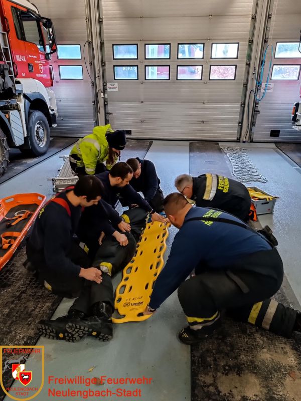 Am 9.12.2023 stand der Umgang mit dem neuen Spineboard im Vordergrund. Unser Sachbearbeiter Feuerwehrmedizinischer Dienst Dominik Huber wiederholte die Handhabung und erklärte die Unterschiede zum zweiten Spineboard, welches schon länger im Vorausrüstfahrzeug verbaut ist. Beide Rettungsbretter wurden natürlich auch praktisch beübt, denn anschließend galt es zusammen mit der Rettungsplattform eine Person aus einem Lkw zu retten.