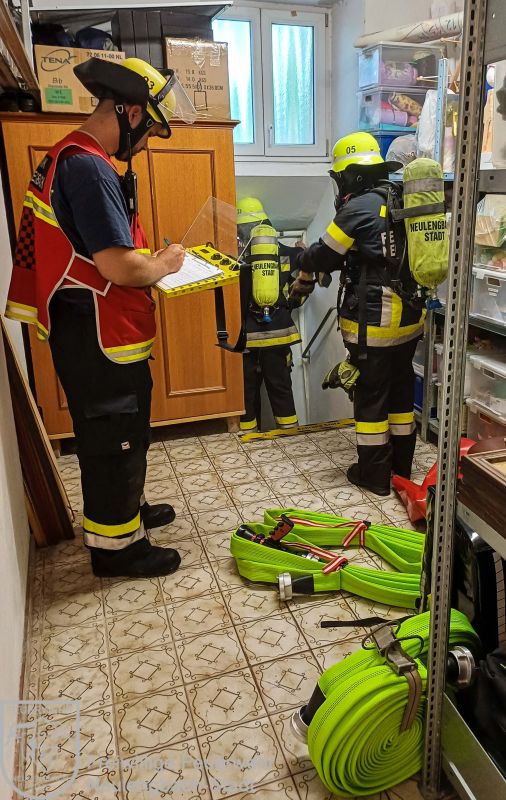 Das bei der Übung ersteintreffende HLF 3 der FF Neulengbach-Stadt bekam von seinem Gruppenkommandanten nach der Lageerkundung den Auftrag, mit einer gefüllten Schlauchleitung und natürlich unter Atemschutz in den Keller vorzudringen, um dort die vermisste Person zu suchen. Währenddessen sollte die Mannschaft des zweiteintreffenden Löschfahrzeugs die Wasserversorgung vom nächsten Hydranten zum HLF 3 herstellen.