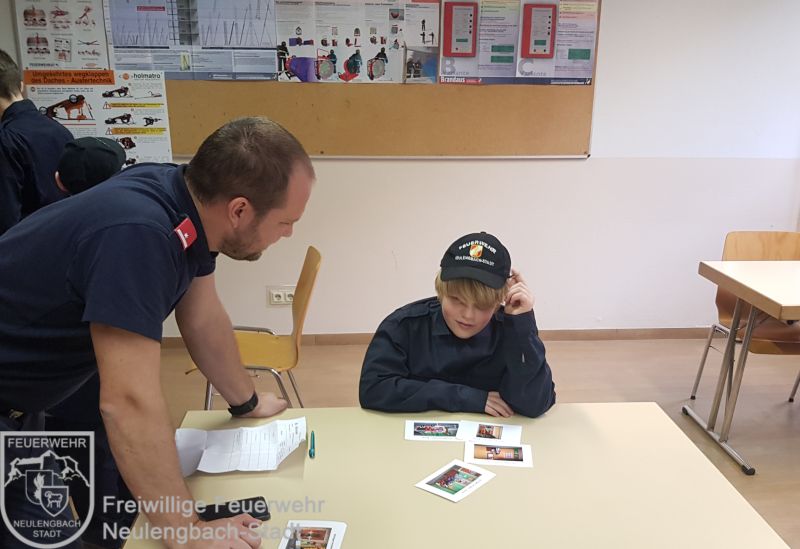 Anschließend teilte sich die Gruppe in unter und über 12 auf. Die jüngeren gingen für ihre Stationen in einen weiteren Schulungsraum, um dort ihre übrigen Disziplinen (Geräte und Zeichen erkennen, Richtiges Verhalten im Brandfall, Absetzen eines Notrufes) abzulegen.