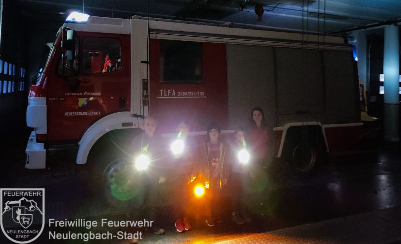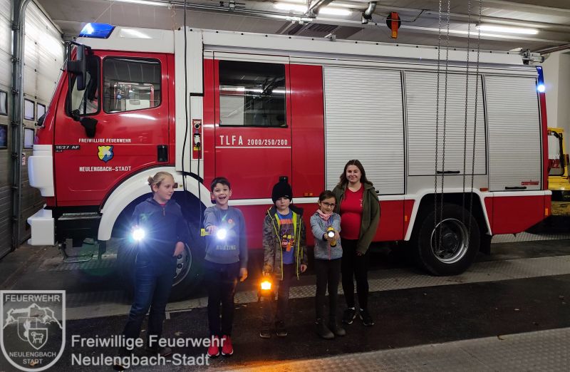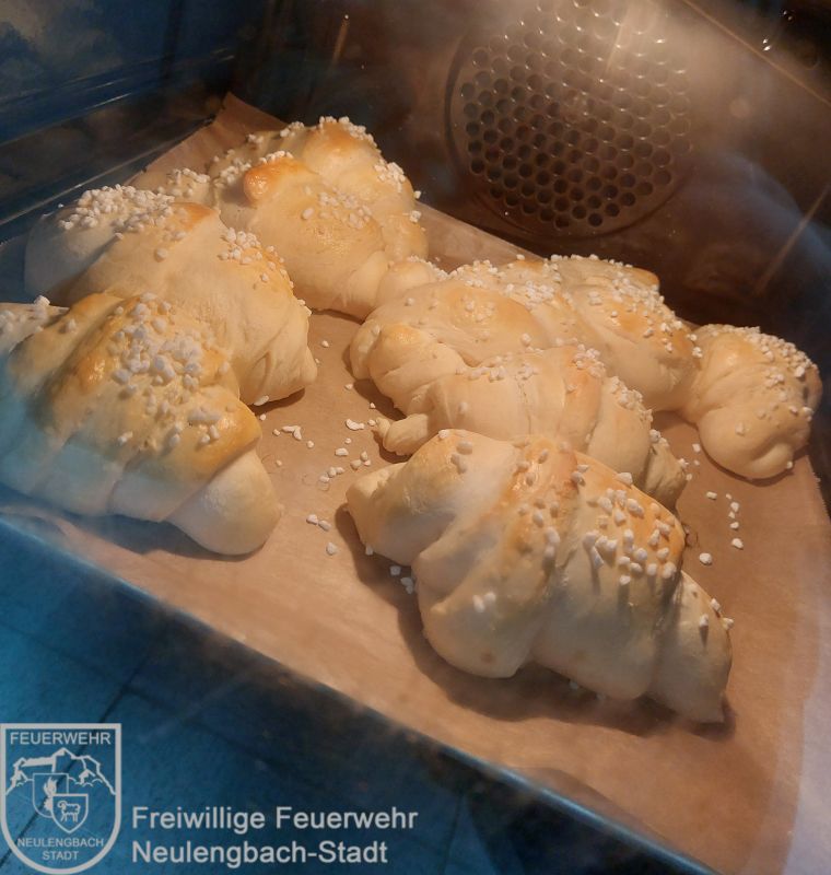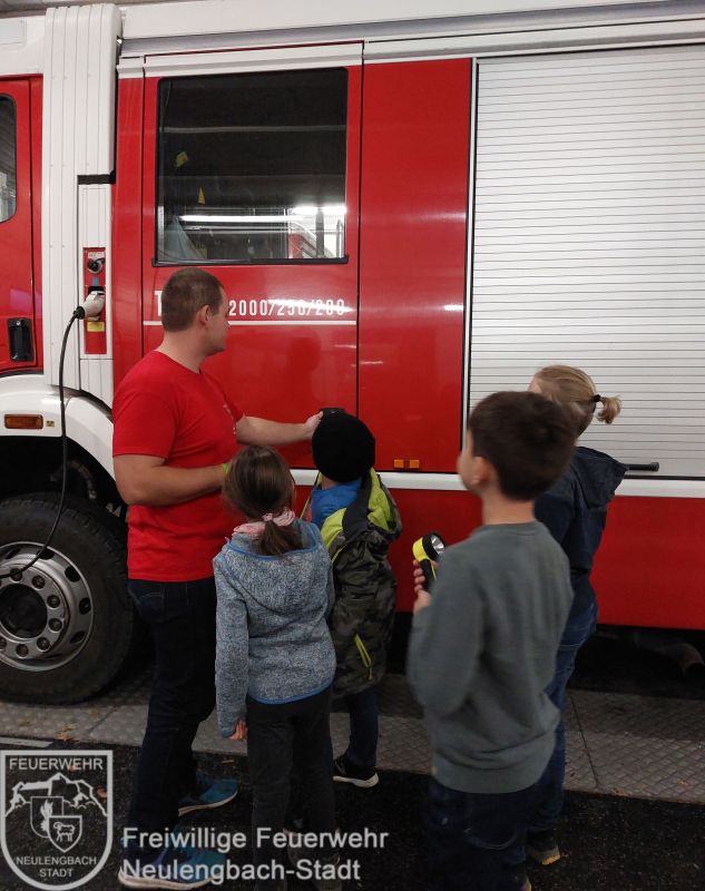 Die Kinder rollten einen von uns vorab vorbereiteten Teig aus, formten daraus Kipferl und beförderten sie in den Ofen. Um die Wartezeit auf das Fertigwerden der Teigwaren zu überbrücken begaben sich die Kinder mit den Betreuerinnen und Betreuern in die Fahrzeughalle um dort nach Laternen zu suchen, wobei unsere Handscheinwerfer hier den Laternen am nächsten kamen. Statt einer Laternenwanderung spielten wir in der dunklen Fahrzeughalle verstecken, ausschließlich die Handscheinwerfer spendeten das Licht für die Sucher. Am Ende der Stunde wurden die köstlichen Kipferl geteilt und verkostet.