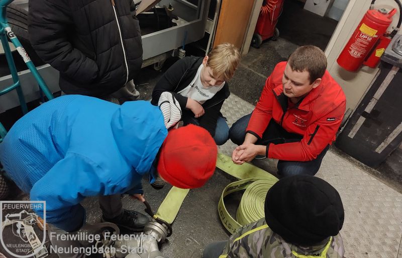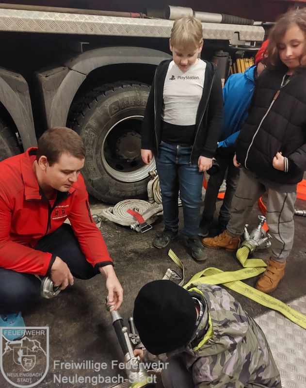 Die Kinder waren erstaunt, wie viele verschiedene Schläuche und Zubehör es bei der Feuerwehr gibt. Spielerisch wurden den Kindern Schläuche, Strahrohre, Verteiler, Übergangsstücke, Schlauchhalter, Schlauchträger und Kupplungsschlüssel erklärt. Im Anschluss konnten die Kinder beim Kuppeln selbst ausprobieren, welche Teile wie zusammenpassen.