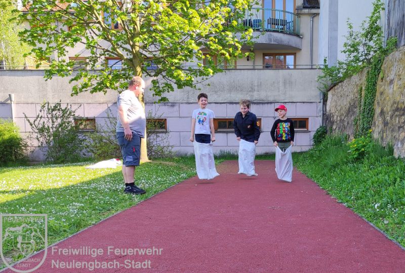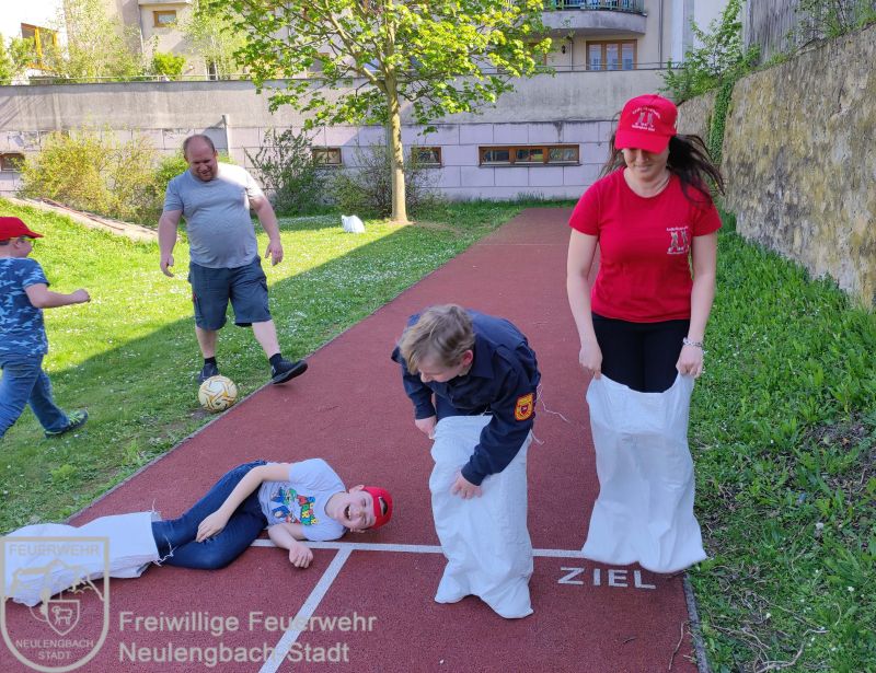 Die Kinder verglichen den unterschied der Durchflussmengen von Kübelspritze, D-Druckschlauch und C-Druckschlauch bei einem kleinen Wettspritzen. Auch körperliches Geschick wurde ausgetestet bei Sackhüpfen, Dosen werfen, Seilziehen und Fußball spielen.
