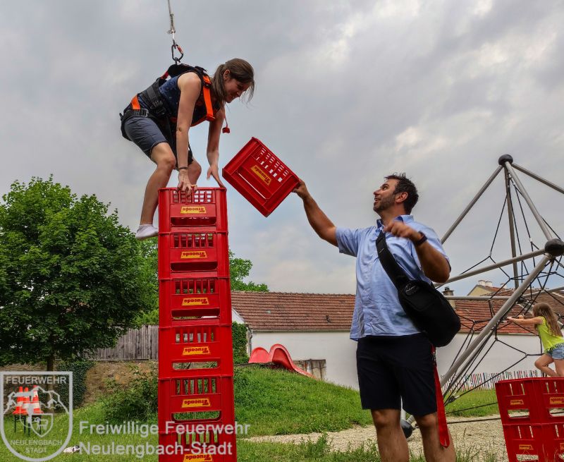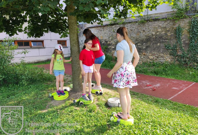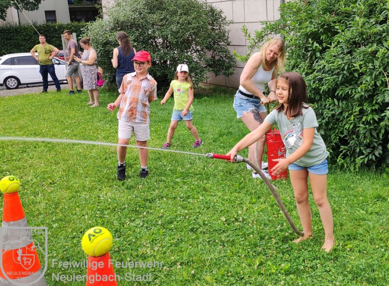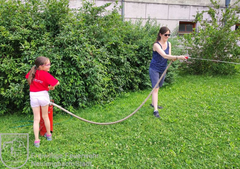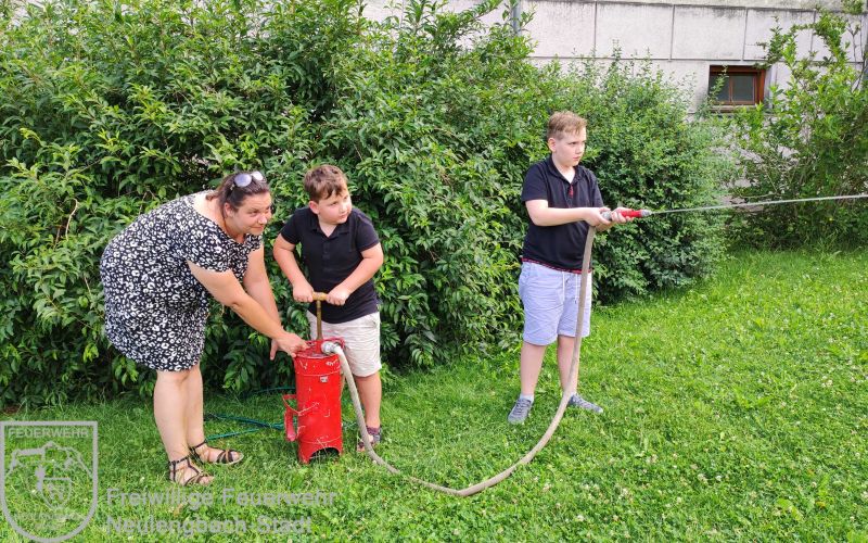 , zu der die Kinder ihre Familien mitbringen durften. In gemütlichem Rahmen hatten die Kinder die Möglichkeit zusammen mit ihrer Familie eine vorbereitete Fotopräsentation anzuschauen und ihre Mappen, welche wir im Laufe des Jahres gemeinsam erstellt haben, herzuzeigen. Da sich die Kinder mittlerweile sehr gut im Feuerwehrhaus auskennen nutzten sie die Gelegenheit und machten mit ihren Familien eine Besichtigungstour. Besonderes Highlight war hier natürlich wieder die Fahrzeughalle. Im Garten gab es dann verschiedene Stationen, welche alleine oder im Team ausprobiert werden konnten. Beispielsweise warteten hier auf die Familien ein Schlauchparcours, eine Zielspritzstation und Kistenklettern. Die Familien zeigten sich beeindruckt, was die Feuerwehrkids in nur einem Jahr alles erlebt und gelernt haben.