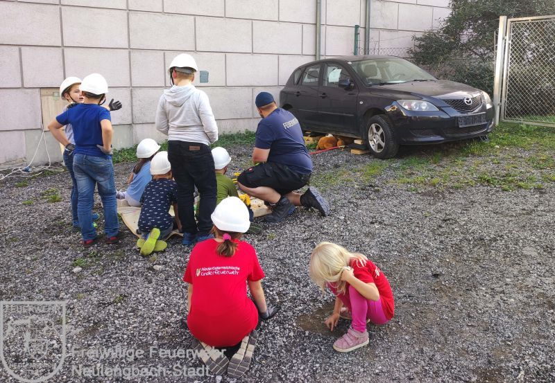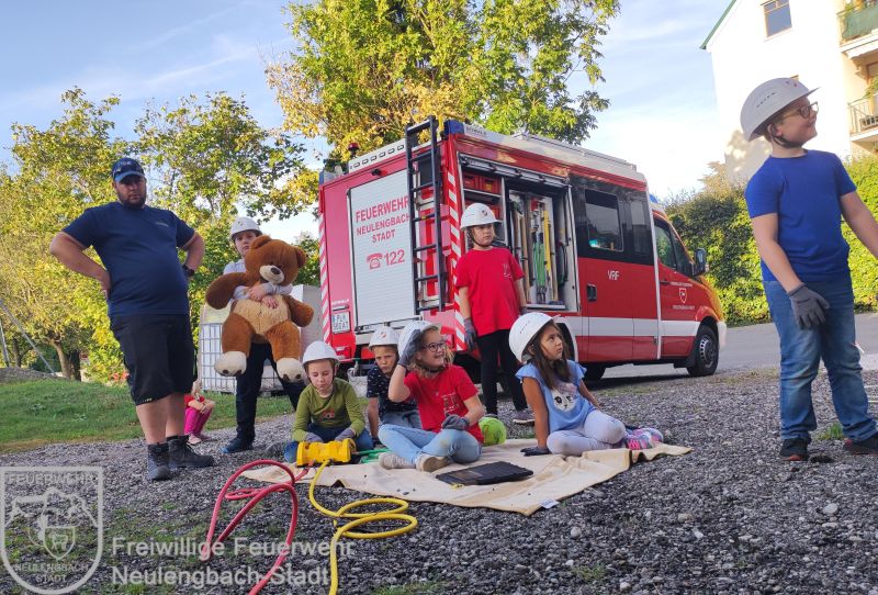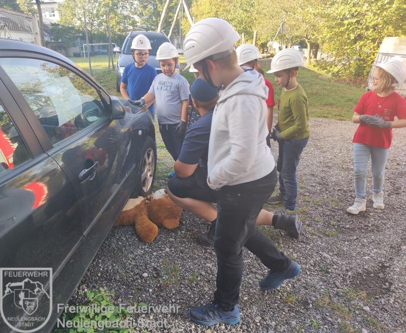 Am 13.10.2023 rettete die Kinderfeuerwehr einen Teddybären, der unter einem Auto eingeklemmt war.