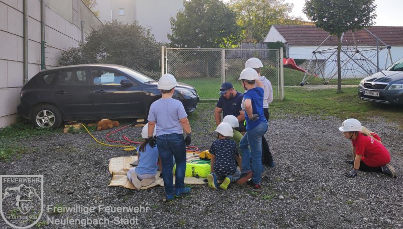 Nachdem der Pkw gegen Wegrollen gesichert war, wurden die Hebekissen samt Zubehör hergerichtet, erklärt und aufgebaut. Kinderleicht konnte so der Pkw angehoben und der Bär gerettet werden.