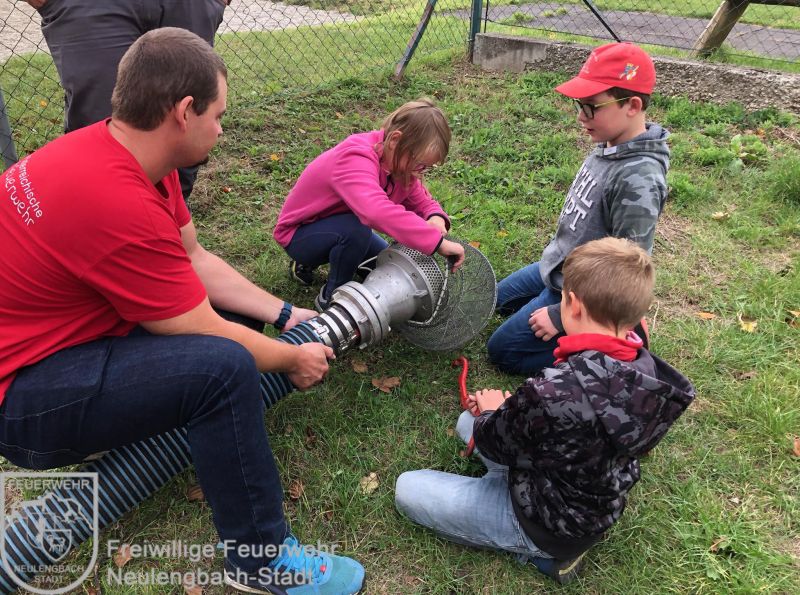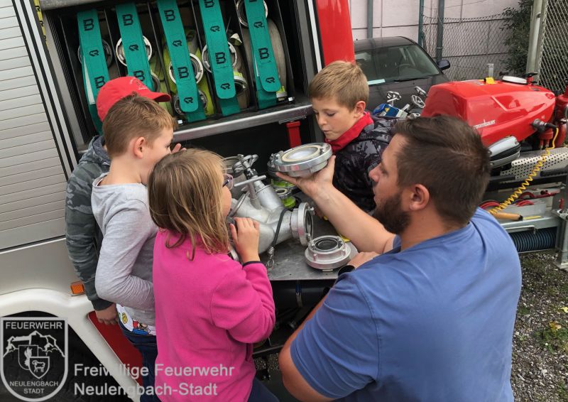 Am 20.10.2023 widmete die Kinderfeuerwehr ihre Aufmerksamkeit dem Löschfahrzeug. Der Funkrufnahme lautet ,,Pumpe“. Das deutet schon darauf hin, das Herzstück dieses Fahrzeuges ist die große Tragkraftspritze, kurz TS genannt. Die großen A-Saugschläuche machten uns schon ein bisschen zu schaffen, war aber auch sehr lustig, diese zu händeln.
