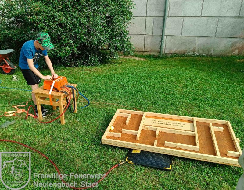 Zu diesem Anlass gestalteten wir wieder eine kleine Abschlussfeier, zu der die Kinder ihre Familien mitbringen durften. In gemütlichem Rahmen hatten die Kinder die Möglichkeit zusammen mit ihrer Familie eine vorbereitete Fotopräsentation anzuschauen und ihre Mappen, welche wir im Laufe des Jahres gemeinsam erstellt haben, herzuzeigen. Da sich die Kinder mittlerweile sehr gut im Feuerwehrhaus auskennen nutzten sie die Gelegenheit und machten mit ihren Familien eine Besichtigungstour. Besonderes Highlight war hier natürlich wieder die Fahrzeughalle. Im Garten gab es dann verschiedene Stationen, welche alleine oder im Team ausprobiert werden konnten. Beispielsweise warteten hier auf die Familien ein Hebekissenlabyrinth, Dosenwerfen und man konnte den Hydraulischen Rettungsspreizer ausprobieren. Zur Abkühlung stand auch ein Wasserwerfer parat. Die Familien zeigten sich beeindruckt, was die Feuerwehrkids in diesem Jahr alles erlebt und gelernt haben.