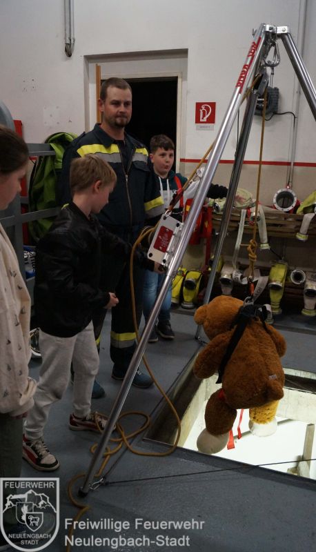 Ein Teddybär war in einen Schacht gestürzt – und die Mädchen und Buben der Kinderfeuerwehr mussten ihn retten! Mithilfe des Dreibeins vom VRF und der 5-Punkt-Sicherheitsgurte war das eine einfache, aber dennoch spannende Übung. In etwa drei Metern Tiefe wurde der Bär hoch- und wieder abgeseilt. Besonders mutige Kinder durften sich anschließend sogar abseilen lassen. Auch Betreuerin Melanie nutzte die Gelegenheit und machte sich mit der Höhen- und Tiefenrettungsausrüstung vertraut.