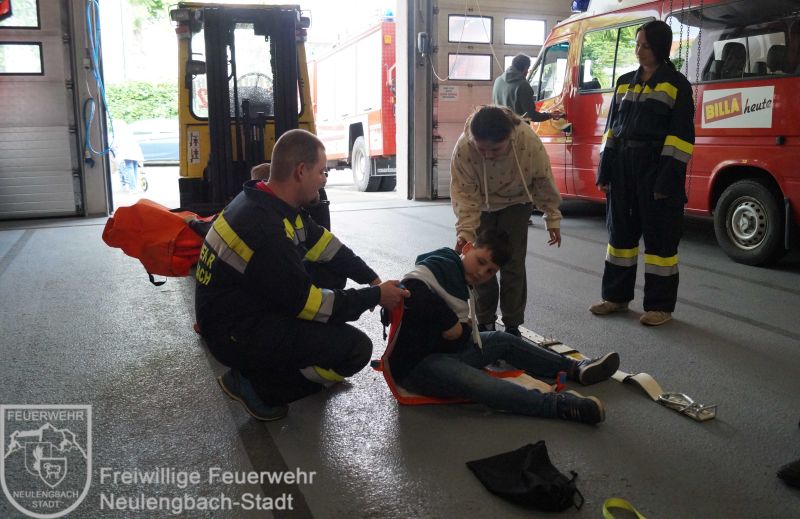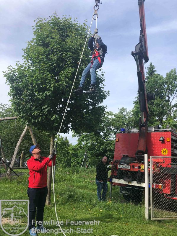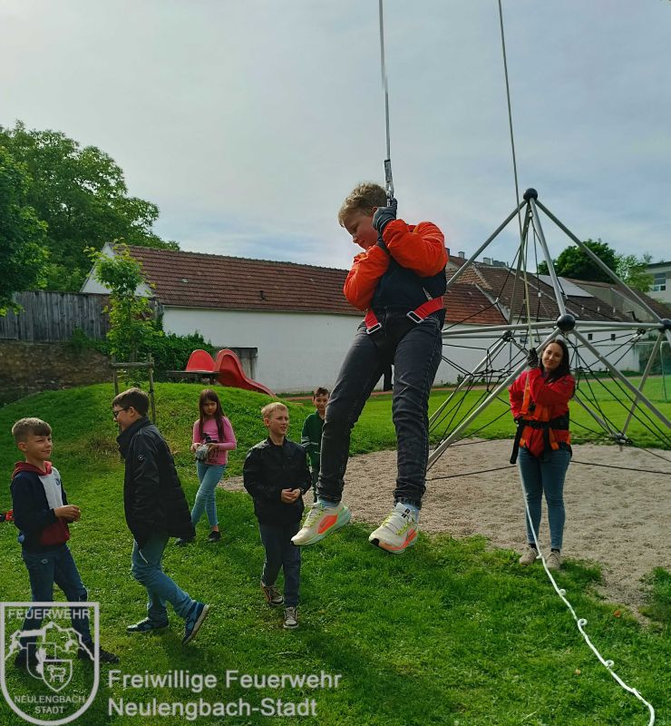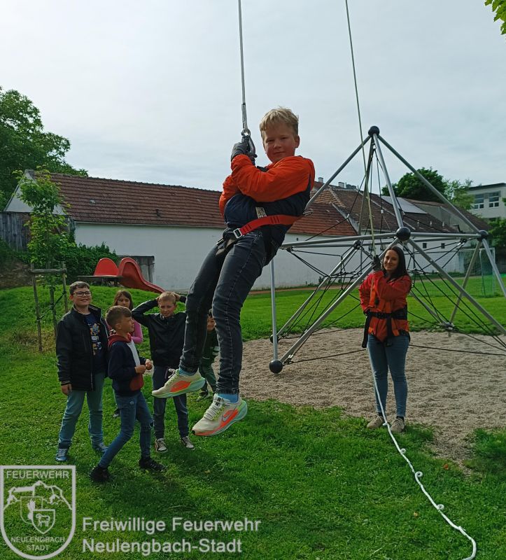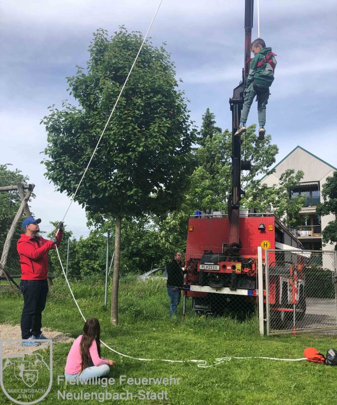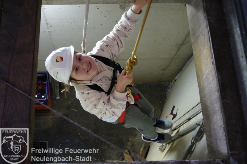 Da den Kindern die Arbeit in luftiger Höhe großen Spaß macht, wurde der Kran des schweren Rüstfahrzeugs aufgebaut. Aus rund 8 Metern Höhe konnten sich mutige Kinder – natürlich gut gesichert – abseilen. Wer lieber am Boden blieb, half bei der Sicherung und unterstützte das Team mit voller Motivation.