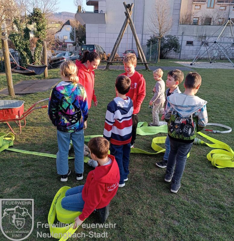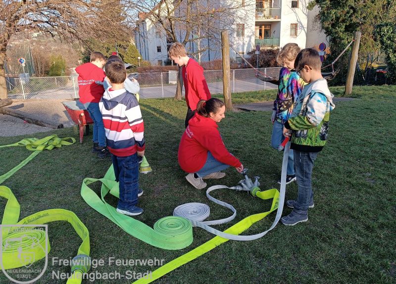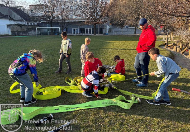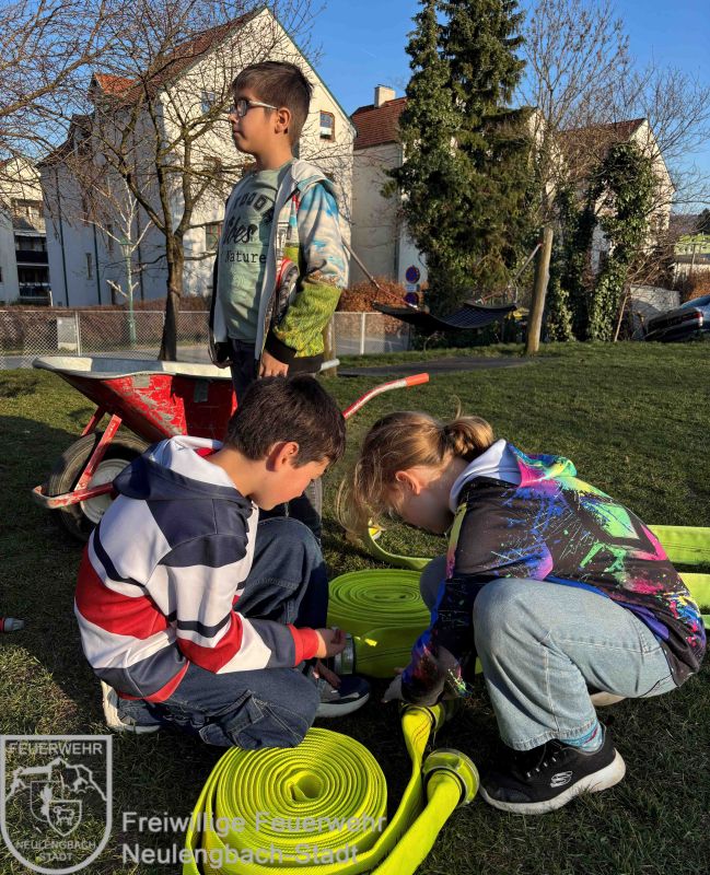 Am 6. März verlegten wir unsere Stunde ins Freie. Auf der Wiese wurden verschiedene Schläuche erklärt und anschließend fleißig gekuppelt – also verbunden. Mit Verteilern und Übergangsstücken konnten alle ihr Können ausprobieren.