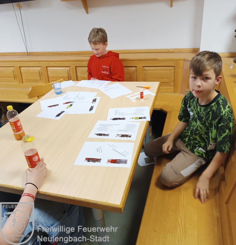 Wir bastelten kleine Büchlein über unseren Fuhrpark – so lernen unsere Kids spielerisch unsere Feuerwehrfahrzeuge kennen. Danach gab es noch ein Highlight: Unsere neuen Kinderfeuerwehr-Pullis wurden abgeholt!